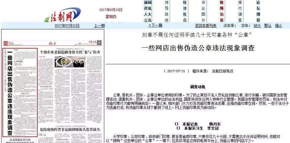《法制日报》最近一篇记者调查显示,在淘宝网的生意参谋中输入“刻章”这个关键词,数据显示全网搜索热度有三万四千余次,全网的商品数有35323个。